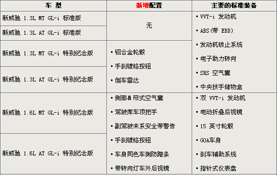 VIOS威馳特別紀(jì)念版涉及1.6L和1.3L兩個(gè)排量級(jí)別的四款車型,其中,1.6L特別紀(jì)念版在原有的GL-i級(jí)別版上追加了側(cè)部及簾式空氣囊、副駕駛未系安全帶警告系統(tǒng),使得安全性得以大幅提升。另外,該車型還增加了駕駛席車頂把手、手剎鍍鉻按鈕、車身同色車側(cè)防蹭條、帶轉(zhuǎn)向燈車外后視鏡等內(nèi)外飾裝備,無論是外觀還是車內(nèi)的裝飾更加充實(shí)。1.3L級(jí)別的VIOS威馳特別紀(jì)念版增加了極受消費(fèi)者歡迎的鋁制輪轂、倒車?yán)走_(dá)、手剎鍍鉻按鈕等配置。
