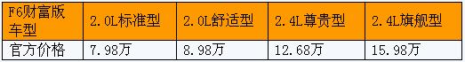 F6財富版的上市取消了豪華型, 標準型7.98萬將價格直接下探至7萬區(qū)間;增配后的舒適型價格也維持8.98萬不變。"比亞迪每年都保持100%的增長速度, 08年20萬輛的銷售目標完成比較輕松, 09年的比亞迪年度銷售目標是40萬輛。" 比亞迪汽車銷售公司總經(jīng)理夏治冰非常自信的說到。而事實上,受上半年良好的業(yè)績支撐,以及巴菲特入股后,比亞迪08年已經(jīng)實現(xiàn)了品牌和銷量的雙豐收。在下半年無太多銷量壓力的情況下,比亞迪卻率先推出F6財富版,明顯的這是凱凱超值定律的延續(xù),著手打造最超值的中級車。