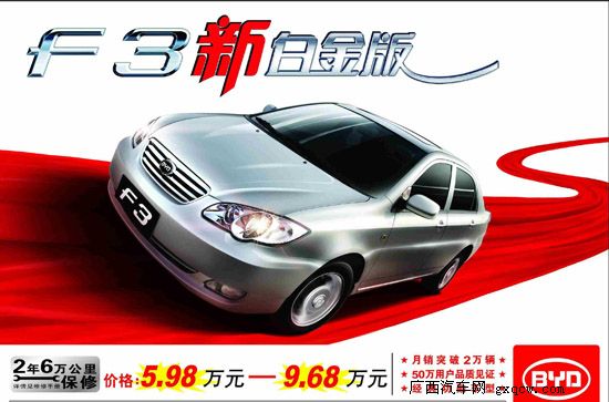 日前從中國汽車工業(yè)協(xié)會了解到,截止本月9日,比亞迪汽車2009年銷量已超過40萬輛,提前實現(xiàn)年度目標(biāo),同比增幅達162%!同時實現(xiàn)銷量連續(xù)六年100%的增長!展示了比亞迪汽車銳意進取、勢不可擋的銷售勢頭!而作為比亞迪汽車品牌的主力軍——F3,更是自8月起連續(xù)位居自主品牌單一車型銷量冠軍,到十一月止,總銷量突破 50萬臺!