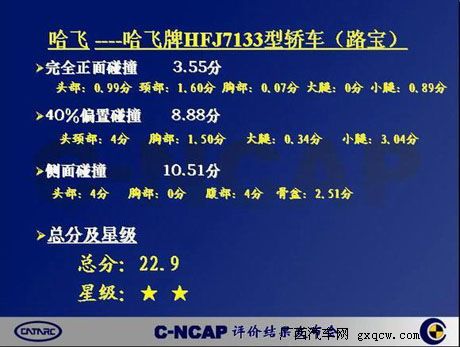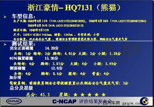 自主小車是不是就意味著不安全?低價(jià)是不是就意味著低質(zhì)?碰撞的結(jié)果中可以看到,有三款車型獲得了三星以上的碰撞成績(jī),這其中,長(zhǎng)城精靈、比亞迪F0分別獲得了三星的成績(jī),吉利熊貓獲得了五星的碰撞成績(jī)。由于個(gè)頭小、吸能空間有限等“先天劣勢(shì)”,在C-NCAP碰撞試驗(yàn)中成績(jī)大多并不理想,撞得三星已屬不易。尤其值得值得注意的是,在這六款車中,吉利熊貓以45.3分的成績(jī)成為首款獲得五星安全的A00級(jí)小車。國家轎車質(zhì)量監(jiān)督檢驗(yàn)中心在評(píng)價(jià)報(bào)告中指出,這標(biāo)志著自主品牌小型車被動(dòng)安全技術(shù)已經(jīng)與國際接軌。應(yīng)該說,對(duì)于在價(jià)格上處于低位的自主品牌小型車來說,這樣的碰撞成績(jī)是可以讓消費(fèi)者放心的。