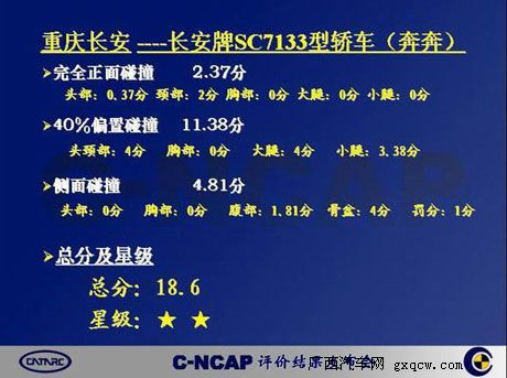 再看另外三款獲得二星碰撞成績(jī)的車型。奇瑞QQ6和哈飛路寶的三項(xiàng)成績(jī)中,完全正面碰撞(“正面100%重疊剛性壁障碰撞”)分?jǐn)?shù)較低,影響了整體成績(jī);長(zhǎng)安奔奔的得分最低,主要是因?yàn)樵凇罢?00%重疊剛性壁障碰撞”和“可變形移動(dòng)壁障側(cè)面碰撞”中成績(jī)較差,其中,在側(cè)面碰撞環(huán)節(jié)中還有一分罰分。從碰撞試驗(yàn)后的實(shí)車照片來看,正面碰撞中長(zhǎng)安奔奔的前臉損毀極為嚴(yán)重,幾乎報(bào)廢,而側(cè)面碰撞不太車身損毀嚴(yán)重,而且被撞擊的左側(cè)車前門甚至在撞擊中開啟。這樣的表現(xiàn)也使得長(zhǎng)安奔奔對(duì)頭部、胸部、大腿、小腿的保護(hù)效果甚微,因此,得分中甚至出現(xiàn)0分項(xiàng)。以此看來,這樣的安全性能就會(huì)讓消費(fèi)者擔(dān)心。