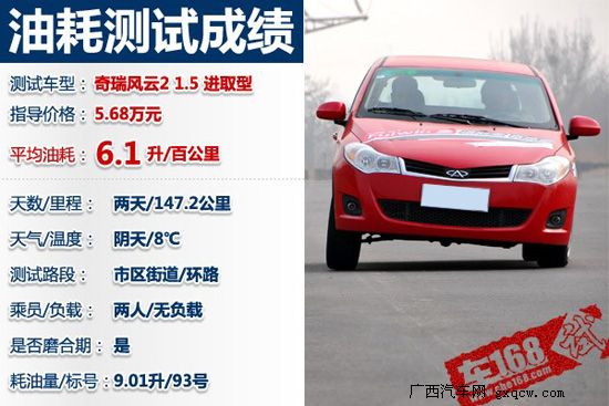 百公里綜合油耗:6.1升 由于奇瑞風(fēng)云2是一款主打家用的三廂轎車,因而我們?cè)趯?duì)其進(jìn)行綜合油耗測(cè)試時(shí),模擬了一條日常行駛路線。其中包括市區(qū)環(huán)路、高速(環(huán)路連接線)、市區(qū)街道(包括擁堵路段)以及考慮到各人駕駛習(xí)慣不同的原因,特意進(jìn)行了一段短暫的激烈駕駛。最終,我們測(cè)得奇瑞風(fēng)云2的百公里綜合油耗為:6.1升。 奇瑞風(fēng)云2在工信部給出的燃油消耗標(biāo)簽上綜合油耗為6.9升,比我們實(shí)際測(cè)得的數(shù)值高了0.8升,看來(lái)這臺(tái)1.5升發(fā)動(dòng)機(jī)的日常經(jīng)濟(jì)性表現(xiàn)還是值得肯定的。 編輯點(diǎn)評(píng):時(shí)尚的外觀、便利的功能設(shè)計(jì)、相對(duì)較低的價(jià)格、良好的駕乘舒適性以及較高的燃油經(jīng)濟(jì)性,這些作為一款實(shí)用型家庭轎車的必備因素,可以說(shuō)在奇瑞風(fēng)云2身上都能找到。其全系車型5.28-6.18萬(wàn)元的價(jià)格區(qū)間以及不到7升百公里綜合油耗,對(duì)于一般工薪階層的消費(fèi)者來(lái)說(shuō),的確是個(gè)不錯(cuò)的選擇。