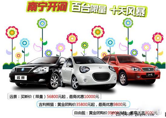 本周,編者從南寧開河吉利4S店了解到,目前店內(nèi)熊貓、自由艦、遠(yuǎn)景車型購車特惠優(yōu)惠時間截至到3月31日: