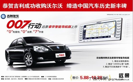近日,編者從吉利方面獲悉,遠景豪華智能導航版即將上市,其配備的GPS導航、可視倒車雷達、真皮坐椅,給廣大用戶提供了更具個性化、更豐富的產(chǎn)品選擇。此外,我司還為新車型上市量身定做了送購置稅、油費、汽車裝潢套裝等近萬元優(yōu)惠的“007”行動。