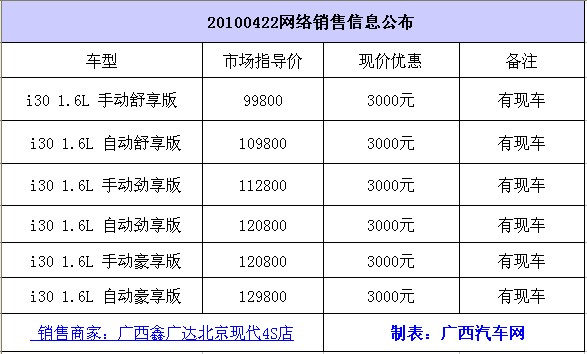 近日,編輯從鑫廣達(dá)北京現(xiàn)代了解到,目前i30、悅動(dòng)均有現(xiàn)車,而i30則全系現(xiàn)金優(yōu)惠3000元,有意出手的朋友,均可到店詳情了解,具體價(jià)格優(yōu)惠請看如下表格: