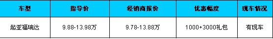 近日,編輯從廣西經銷商處獲悉,目前購買東風悅達起亞福瑞迪)全系優(yōu)惠1000元現(xiàn)金,再送價值3000元禮包,店內有現(xiàn)車。具體信息見下表: