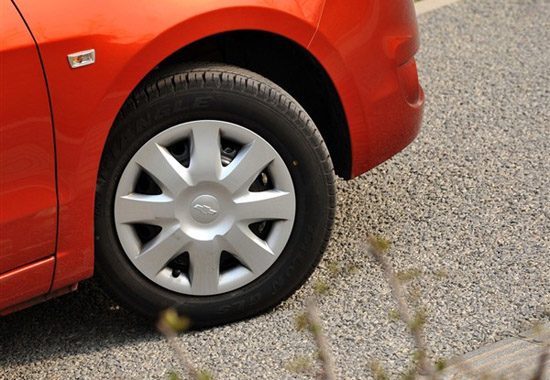 1.2L手動(dòng)理想版標(biāo)配14寸鋼制輪圈,搭配尺寸為175/65 R14的三角牌輪胎,輪圈罩的造型很穩(wěn)重。
