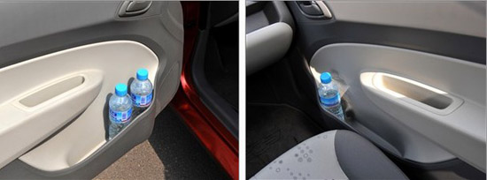 前排門內(nèi)側(cè)的儲物格兼具了杯架的功能,容積不小,放3瓶礦泉水沒問題。