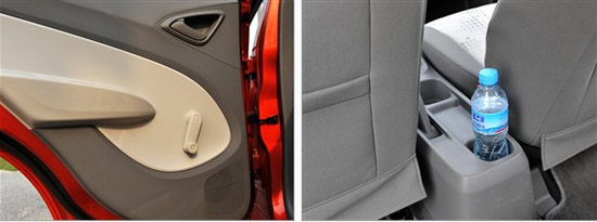 左圖:1.2車型后窗為手搖,門內(nèi)側(cè)沒有儲物空間;右圖:后排只有這一個杯架。