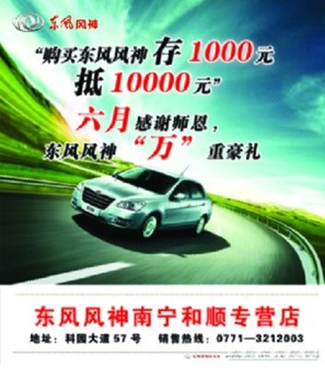 為感謝廣大教師的辛勤工作,東風(fēng)風(fēng)神南寧和順專營店特開展“感謝師恩,風(fēng)神回饋”活動(dòng)。即日起憑教師證購買東風(fēng)風(fēng)神任意車型即可優(yōu)先享受“存1000元抵10000元”大禮優(yōu)惠,還有更多豪禮,詳情請到店咨詢。