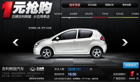 “10天一共吸引了近300萬(wàn)網(wǎng)友的廣泛關(guān)注,網(wǎng)絡(luò)4S店的客服每天都會(huì)收到幾百條在線咨詢(xún)信息,活動(dòng)的火熱程度大大出乎我們的意料! 吉利全球鷹品牌事業(yè)部負(fù)責(zé)人指出:自6月1日至7月18日,吉利全球鷹品牌啟動(dòng)了1元搶購(gòu)吉利熊貓活動(dòng)以來(lái), 1元搶拍熊貓成為目前網(wǎng)上最時(shí)尚、最具吸引力的網(wǎng)絡(luò)拍拍活動(dòng)。