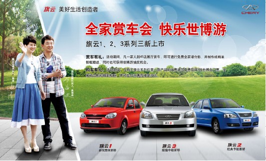 具體而言,整個活動包括:賞車有禮、購車有禮、全家世博游抽獎等三大內(nèi)容;顒悠陂g,客戶只要到店賞車,奇瑞4S店就會有好禮相贈,更有全家福留影及相框禮品相送;購車的消費者,更能獲贈多張世博會門票;所有參與活動人員,均可同時參加奇瑞旗云特設(shè)的世博游抽獎,有機會與家人一起免費全程游世博,共享活動禮上加禮的優(yōu)厚待遇。