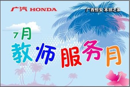 隨著暑期長(zhǎng)假的來(lái)臨,不少教師可以從百忙工作中抽出時(shí)間選購(gòu)自己心儀的車(chē)型,享受難得的輕松時(shí)刻。廣本恒安店特別為教師推出了7月特別服務(wù)活動(dòng)。凡到店看車(chē)、購(gòu)車(chē)或者參加保養(yǎng)的教師均可享受特別優(yōu)惠待遇。