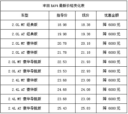 (廣西汽車網(wǎng) 訊)近日,廣西汽車網(wǎng)編輯從一汽豐田南寧廣緣4S店了解到,RAV4車型目前全系優(yōu)惠6000元,據(jù)店內(nèi)工作人員介紹,店內(nèi)有少量現(xiàn)車,感興趣的網(wǎng)友可以跟商家做進一步的了解。具體詳情請見下表: