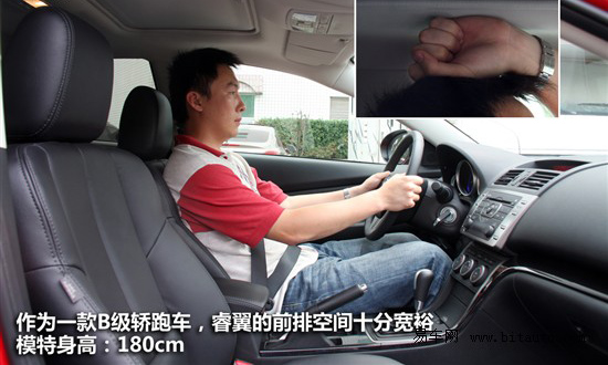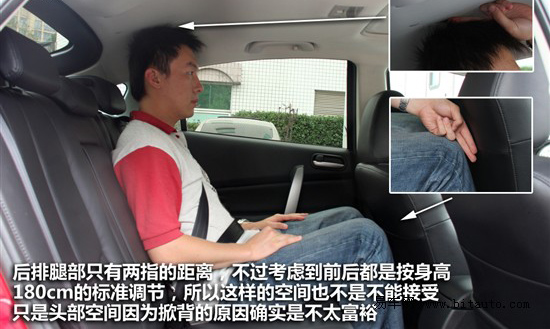雖然主打運動,但睿翼轎跑終究是一款B級轎車,所以在空間的表現(xiàn)上還是不錯的。圖中模特身高180cm,在前排可以很容易的找到一個合適的姿勢,而頭部還有將近一拳的距離。后排座椅因為受到掀背式設計的影響,所以頭部空間略顯緊張,腿部空間的表現(xiàn)在同級車級車中屬于正常水平。