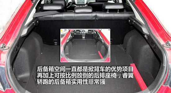 后備箱空間一直是掀背式車型的一個優(yōu)勢,睿翼轎跑也不例外。雖然后備箱的絕對空間并不是很夸張,但是后備箱的開啟方式使睿翼轎跑的后備箱實用性非常強,如果再加上可以按比例放倒的后排座椅,睿翼轎跑的運載能力在同級別車型中絕對算得上成。