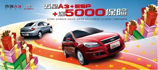據(jù)介紹,該活動針對奇瑞A3旗下所有車型展開,消費者只要購買奇瑞A3任意一款車型即可獲贈總價值高達5000元的保險,包括交強險、車輛損失險、商業(yè)第三者責(zé)任險、車上人員責(zé)任險、全車盜搶險、玻璃單獨破碎險,而這6個保險項目幾乎已經(jīng)涵蓋了目前國內(nèi)汽車市場中的主流車險項目。