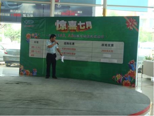 2010年7月25日在科園大道55號廣西鑫廣達奇瑞4S店舉行的“驚喜七月—--奇瑞汽車A3、A5專場團購”活動圓滿結(jié)束了。活動當天,由銷售經(jīng)理親自主持本次專場活動,成績喜人,現(xiàn)場訂交22臺。