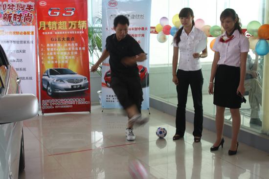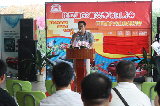 7月25日,坤馳4S店聯(lián)合廣西汽車網(wǎng)舉行比亞迪G3、F3R首次專場(chǎng)大型團(tuán)購會(huì),參加團(tuán)購人數(shù)35名,當(dāng)天總共成交10臺(tái)。