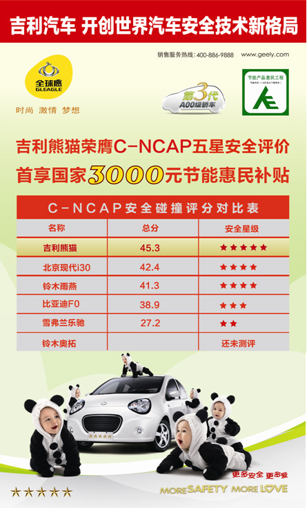 在2009年12月29日,中國(guó)汽車技術(shù)研究中心在天津公布了09年第四批6個(gè)車型的評(píng)價(jià)結(jié)果,吉利熊貓以45.3分的成績(jī),成為首款獲得五星安全的A00級(jí)小車。