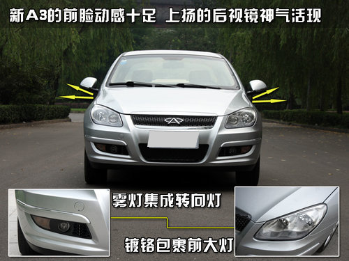 全新奇瑞A3在外觀方面的變化并不大,依舊采用老款動感十足的設(shè)計風(fēng)格。略微上揚的后視鏡讓車頭看起來神氣活現(xiàn)。