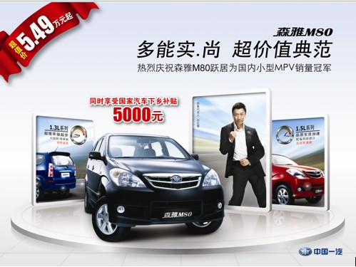 “山雨欲來風(fēng)滿樓”,本著做大做強(qiáng)自主品牌和還惠于民的中國一汽介入市場,引起了經(jīng)濟(jì)型轎車市場的強(qiáng)烈震撼,引導(dǎo)著中國經(jīng)濟(jì)型轎車市場重新洗牌、進(jìn)入一個(gè)新的時(shí)代。“一哥”出手了,中國一汽森雅M80上市以來,銷售異;鸨,迅速成為奮斗中的年輕精英的經(jīng)濟(jì)型用車和成功人士第二臺車的購車首選。并給予其“卓越國民車小型MPV休旅典范”的美譽(yù)。
