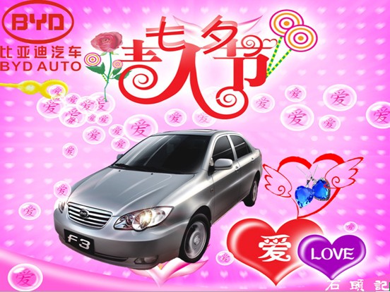 2010年8月15日至16日——七夕之日,高新區(qū)康和富利比亞迪4S旗艦店,打造七夕情侶版比亞迪F3,在物欲橫流的今天,城市精英們對(duì)人文理念的追求大幅攀升?岛透焕m應(yīng)城市精英們蓬勃向上、高雅溫情的文化追求理念。打造了一款獨(dú)特的情侶版轎車(chē)比亞迪F3,在傳承比亞迪高性價(jià)比的基礎(chǔ)上,更帶來(lái)精神上的滿足。