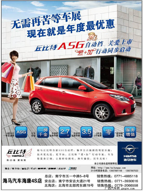 丘比特ASG自動檔樣車已到南寧海康店,定價(jià)6.39-7.19萬元。丘比特ASG是海馬汽車在“家轎進(jìn)化論”指導(dǎo)下而推出的A0級家轎最新力作。海馬汽車?4S店副總經(jīng)理謝富寧表示,專為丘比特量身定做的營銷產(chǎn)品——“愛+加”營銷行動也同步啟動,它通過整合運(yùn)用汽車金融平臺、售前和售后服務(wù)體系等營銷資源,將丘比特的產(chǎn)品競爭力和品牌含金量提升到了一個(gè)全新的水平。同時(shí)還推出了 丘比特“愛+加”營銷行動, 主要有 “丘比特金融專屬服務(wù)(買半貸半零息零手續(xù)費(fèi))”、“一擲千金”訂車搶金活動、“愛相隨”服務(wù)增值禮包等三項(xiàng)活動。
