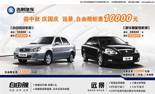 據(jù)了解,吉利汽車2010年上半年實(shí)現(xiàn)銷售200969輛,同比增長(zhǎng)36.7%,完成全年任務(wù)的50.2%,實(shí)現(xiàn)了時(shí)間過(guò)半,任務(wù)過(guò)半的好成績(jī),旗下全球鷹品牌產(chǎn)品8月終端環(huán)比7月逆市上漲30%,為進(jìn)一步在9月擴(kuò)大終端銷量,保持自主車企名列前茅的位置,特推出本次史上規(guī)模最大的促銷活動(dòng)。