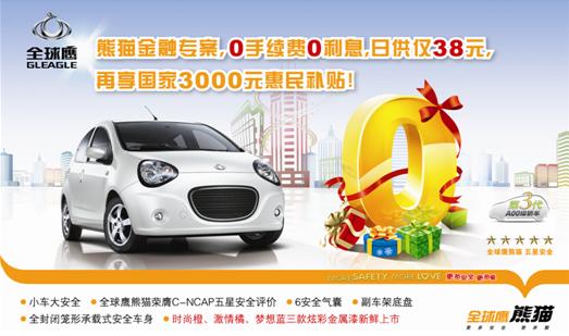 通過(guò)本次活動(dòng)您只需支付凈車價(jià)的30%做為首付,無(wú)擔(dān)保,無(wú)抵押,0利率,0手續(xù)費(fèi),日供僅需38元,每天剩下一餐午飯或者一張魔獸的點(diǎn)卡的費(fèi)用就能擁有夢(mèng)想的吉利熊貓,讓更多的愛車族能輕松步入有車一族的行列。