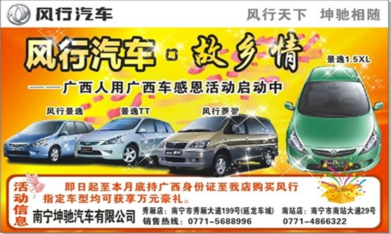 風(fēng)行天下,坤馳相隨,風(fēng)行汽車故鄉(xiāng)情——廣西人用廣西車感恩活動啟動中。即日起至本月底凡持廣西身份證至店購買風(fēng)行指定車型均可獲享萬元豪禮。