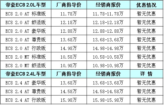 目前,廣西富緣汽車銷售服務(wù)有限公司帝豪4S店對EC8全面接受預(yù)定,預(yù)計提車時間為20天左右,最讓人驚喜的是,該店爭取到了這款車的工程樣車,您可以先到店試駕該款新車,親身領(lǐng)略這款車的魅力。其上市車型和售價見下表: