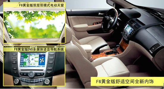 F6黃金版在原基礎(chǔ)上新增了兩款新車型:1.8LMT和2.0LCVT。2.0L CVT尊享型搭載了CVT無(wú)級(jí)變速箱,實(shí)現(xiàn)了零時(shí)差加速、零動(dòng)力耗損,零換擋沖擊。車內(nèi)配置方面,F(xiàn)6黃金版材質(zhì)和做工更顯“精致、高貴”,內(nèi)飾多選用綠色環(huán)保材料。另外,方向盤、中央扶手、換檔手柄等均采用皮質(zhì)材料包裹,部件的接縫處更顯細(xì)致。中央集控方向盤的配備,使得音響操控十分方便,組合儀表運(yùn)用了白色LED冷光護(hù)眼指針,與黑表盤的高反差對(duì)比實(shí)現(xiàn)了全天候高清晰度的識(shí)別性。而雙模多媒體音頻輸入接口(USB+AUX)、雙溫區(qū)獨(dú)立控制自動(dòng)空調(diào)、CAN-BUS電子智能管家系統(tǒng)及車內(nèi)空氣凈化系統(tǒng)等豪華配置,處處體現(xiàn)出F6黃金版的超值優(yōu)勢(shì)。