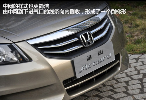 2011款的雅閣在外觀方面并沒(méi)有進(jìn)行大刀闊斧的改變,但仔細(xì)觀察之下你會(huì)發(fā)現(xiàn)它與奧德賽、歌詩(shī)圖越來(lái)越像,車頭從側(cè)面看上去不再那么平直,而產(chǎn)生了一些弧度。中網(wǎng)的樣式也更簡(jiǎn)潔,由中網(wǎng)到下進(jìn)氣口的線條向內(nèi)側(cè)收,形成了一個(gè)倒梯形,霧燈部分的線條處理更加強(qiáng)勢(shì),整體與老款車型相比更加霸氣。