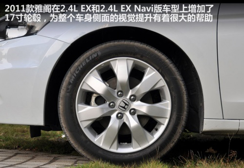 因?yàn)槲覀兡玫降脑囻{車是2.0L車款,所以并未使用17寸輪轂,2011款雅閣增加了使用17寸輪轂的車型覆蓋面,老款車型只有V6版本和2.4L頂配車型才用的17寸輪轂,本次也標(biāo)配于2.4L EX和2.4L EX導(dǎo)航版車型上。后視鏡的造型也得到優(yōu)化,保留較大的視野之余,空氣動(dòng)力學(xué)的改變也降低了行駛噪音的產(chǎn)生。
