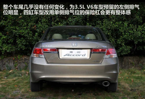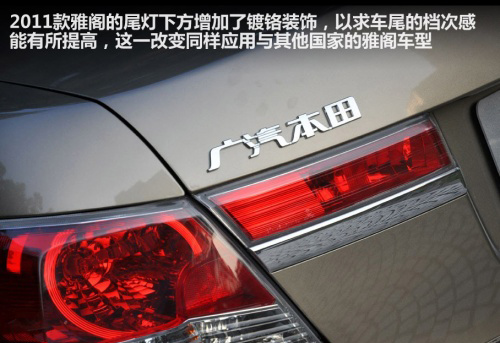 2011款雅閣的尾燈下方增加了鍍鉻裝飾,以求讓車尾的檔次感能有所提高,這一改變同樣應(yīng)用與其他國(guó)家的雅閣車型,本田技研的工程師告訴我們,本田在國(guó)內(nèi)車型上的標(biāo)準(zhǔn)是與全世界同步的。