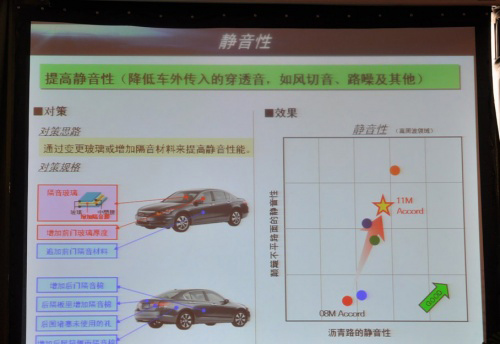 2011款雅閣的外觀改變不大,卻在看不到的地方進(jìn)行了很多調(diào)整,很多消費(fèi)者反饋第八代雅閣的靜音性不是非常理想,雅閣的工程師為2011款雅閣設(shè)計(jì)了很多隔音措施。前風(fēng)擋和前門的玻璃更換為更厚的隔音玻璃,四個(gè)車門、后備箱和后葉子板處增加了隔音棉,并且將車尾部分未使用到的預(yù)留孔位進(jìn)行了填堵,整個(gè)車廂內(nèi)的安靜程度有所提升,這在后面的駕駛環(huán)節(jié)會(huì)有所體驗(yàn)。