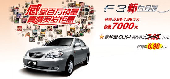 在新春佳節(jié)來臨之際,為答謝廣大消費者一直以來的支持和厚愛,比亞迪汽車特舉辦“感恩百萬銷量,真情賀歲鉅惠”活動;顒悠陂g,搭載日本原裝三菱4G15S發(fā)動機(jī)的F3豪華型鋸惠呈現(xiàn)。冠軍配置、冠軍品質(zhì)、冠軍服務(wù),再加上超高的價值,直接刺激了F3在歲末車市的火爆,掀起了搶購的狂潮。