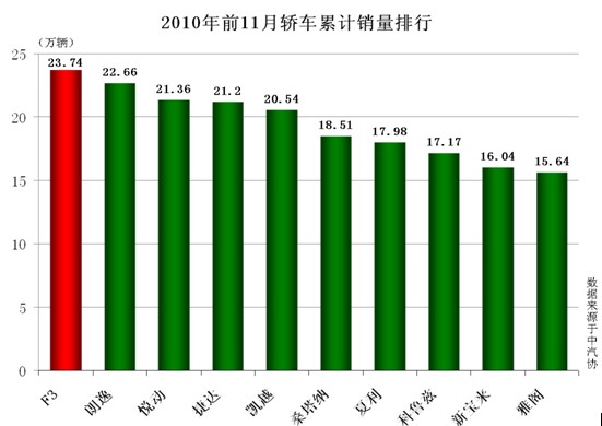 根據(jù)中汽協(xié)數(shù)據(jù)顯示,2010年1月-11月,比亞迪F3累計銷售23.74萬輛,以明顯的優(yōu)勢榮膺單車銷售冠軍。F3在2010年前11月保持熱銷狀態(tài)并取得銷量冠軍的寶座,得益于冠軍般的品質(zhì),冠軍般的服務(wù)。年末的給力鉅惠,將使F3的冠軍地位更加不可動搖。