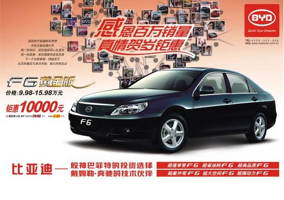 根據(jù)中汽協(xié)最新數(shù)據(jù)顯示,比亞迪首款中高級車型F6黃金版 1.8在過去一年里銷量持續(xù)攀升,穩(wěn)居中高級車市主流陣營,贏得了眾多消費者的青睞。為了答謝廣大消費者的厚愛,比亞迪啟動“感恩百萬銷量,真情賀歲鉅惠”活動,最高鉅惠一萬元,使得F6黃金版的“凱凱黃金定律”再次升級,在群雄逐鹿的中高級車市充分彰顯了其超值優(yōu)勢,掀起了新年購車潮。
