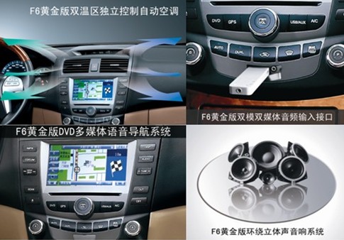F6黃金版1.8不僅外觀設(shè)計大氣穩(wěn)重,在配置上也是精益求精,注重豐富實用性,不僅提供了很多舒適性配置,也添加、優(yōu)化了部分電子設(shè)備。它版配備了CAN-BUS電子智能管家系統(tǒng)、雙模多媒體音頻輸入接口、雙溫區(qū)獨立控制自動空調(diào)、“FOLLOW ME HOME大燈延遲關(guān)閉系統(tǒng)、車內(nèi)空氣凈化系統(tǒng)等眾多高端配置,更顯高檔、舒適。