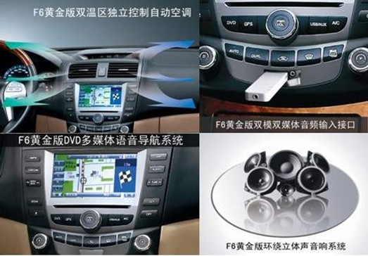 車內(nèi)配置方面,F(xiàn)6黃金版擁有雙層雙模天窗、雙溫區(qū)獨立控制自動空調(diào),可以為駕乘者創(chuàng)造清爽的車內(nèi)環(huán)境。音響控制系統(tǒng)、DVD多媒體系統(tǒng)以及NAVI語音導(dǎo)航系統(tǒng)等豪華配置,帶給駕乘人員自由舒適的駕乘體驗。在安全配置方面,F(xiàn)6黃金版配備的車門內(nèi)置防側(cè)撞安全保護桿/兒童安全鎖、車門及行李箱未關(guān)獨立警示、三色顯距倒車影像監(jiān)視系統(tǒng)、自動開啟前大燈等高科技配置,大大增強了行車安全性,真正體現(xiàn)出了F6黃金版的人性化設(shè)計。此外,比亞迪F6黃金版前懸架采用雙橫臂獨立式,后部采用五連桿雙橫臂獨立懸架,整體調(diào)校韌勁十足,操控靈活,穩(wěn)定安全。