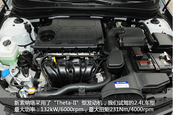 新索納塔裝備2.0L和2.4L兩個(gè)排量的“Theta-II”型發(fā)動(dòng)機(jī),2.0L發(fā)動(dòng)機(jī)最大功率:121kW/6200rpm,最大扭矩198Nm/4600rpm。我們?cè)囻{的2.4L發(fā)動(dòng)機(jī)最大功率:132kW/6000rpm,最大扭矩231Nm/4000rpm。兩款動(dòng)力均搭配6速手自一體變速箱。