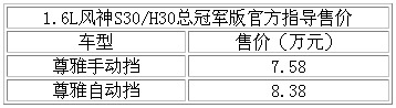 同時(shí)上市的還有H30 總冠軍版。兩個(gè)車型主要包括尊雅型手動(dòng)、自動(dòng)4款車型,限量發(fā)售,售價(jià)為7.58-8.38萬(wàn)元。