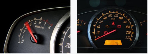 寶駿630采用了傳統(tǒng)的指針式儀表盤,設(shè)計(jì)風(fēng)格非常簡潔明確,而且采用橘色背景光。整個組合式儀表盤采用了三模塊設(shè)計(jì),從左到右依次是引擎轉(zhuǎn)數(shù)表、時速表還有油表;蛟S是要照顧“對稱設(shè)計(jì)”的目的,筆者很難理解把儀表盤的如此大的空間用來單一顯示剩余燃油量的目的。不過紅色的指針確實(shí)很有警示作用。
