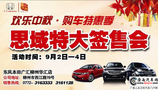 廣匯廣西機(jī)電歡樂中秋•特惠購車季活動已歡樂啟動,五百萬豪禮感恩回饋消費者。東本廣匯柳州華匯店特惠購車活動同步開啟,并于9月2-4日傾力打造思域總經(jīng)理簽售會回饋龍城客戶。活動期間訂車除了能享受超低的優(yōu)惠政策,還能獲得額外的超級禮包!進(jìn)店均有精美禮品相送,希望有想購買東風(fēng)本田思域車系的朋友不要錯過這次優(yōu)惠的時機(jī)!!