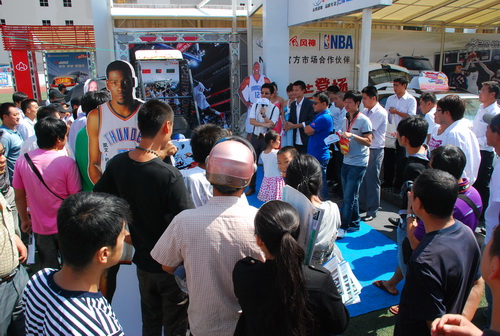 在西部巡展內(nèi)蒙古自治區(qū)赤峰站巡展現(xiàn)場(chǎng),“品質(zhì)風(fēng)神 激情共享-東風(fēng)風(fēng)神邀您共賞NBA”主題活動(dòng)如期舉行。該活動(dòng)吸引了大批現(xiàn)場(chǎng)觀眾,籃球愛(ài)好者們踴躍報(bào)名參與。與NBA明星比身高,障礙運(yùn)球,終極投籃等活動(dòng)讓觀眾玩在其中,快樂(lè)無(wú)比。為配合西部巡展,東風(fēng)風(fēng)神赤峰海森專營(yíng)店還在巡展現(xiàn)場(chǎng)重磅推出了“投進(jìn)一球,購(gòu)車(chē)減一百”的促銷活動(dòng),即現(xiàn)場(chǎng)每位購(gòu)車(chē)意向客戶有五次投籃機(jī)會(huì),每投中一球購(gòu)車(chē)便可減100元現(xiàn)金。這一活動(dòng)的推出讓現(xiàn)場(chǎng)猶豫不決的潛在客戶果斷出手。他們紛紛一試身手,誓用手中的籃球?yàn)樽约黑A得實(shí)惠。