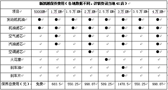 新凱越提供2年或6萬公里保修,同樣以一年2萬公里計算,首保提供免費服務,第二次常規(guī)保養(yǎng)費用約為683元,第三次更換發(fā)動機機油和機油濾芯需花費550元,第四次保養(yǎng)需更換空濾、汽濾和空調(diào)濾芯等項目,費用約為998元,如此計算新凱越平均一年保養(yǎng)費用大概在2231元左右。