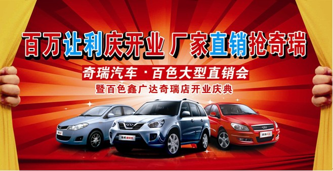 別著急,奇瑞汽車為您提供安全與便利。百色市鑫廣達(dá)奇瑞店在10月16日隆重推出以“百萬(wàn)讓利慶開業(yè) 廠家直銷搶奇瑞”為主題的奇瑞汽車大型直銷會(huì)(暨百色鑫廣達(dá)奇瑞店開業(yè)慶典),在這次的直銷會(huì)中,百色市鑫廣達(dá)奇瑞店將展示近30臺(tái)限量鉅惠奇瑞汽車,每臺(tái)車的優(yōu)惠幅度都是前所未有的。