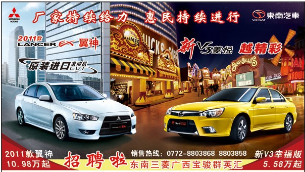 為了幫助消費者適應新節(jié)能汽車推廣補貼政策,更為回饋廣大新老用戶,東南汽車將“自掏腰包”對V3菱悅全車系進行惠民續(xù)補。凡在2011年10月1日至2011年10月31日期間購買V3菱悅系列任一車款,均可繼續(xù)享受由東南汽車推出的3000元惠民補貼!